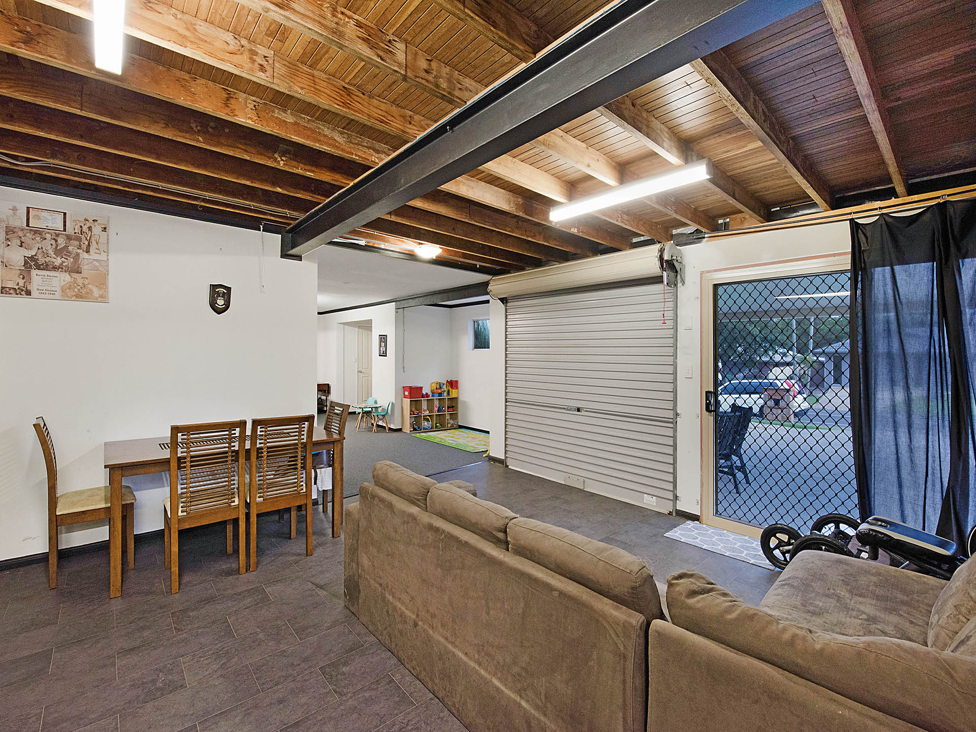 Plenty of room for a bed or two (with built-in cupboards and more storage under the steps), a study, and workshop area in the converted double garage section.