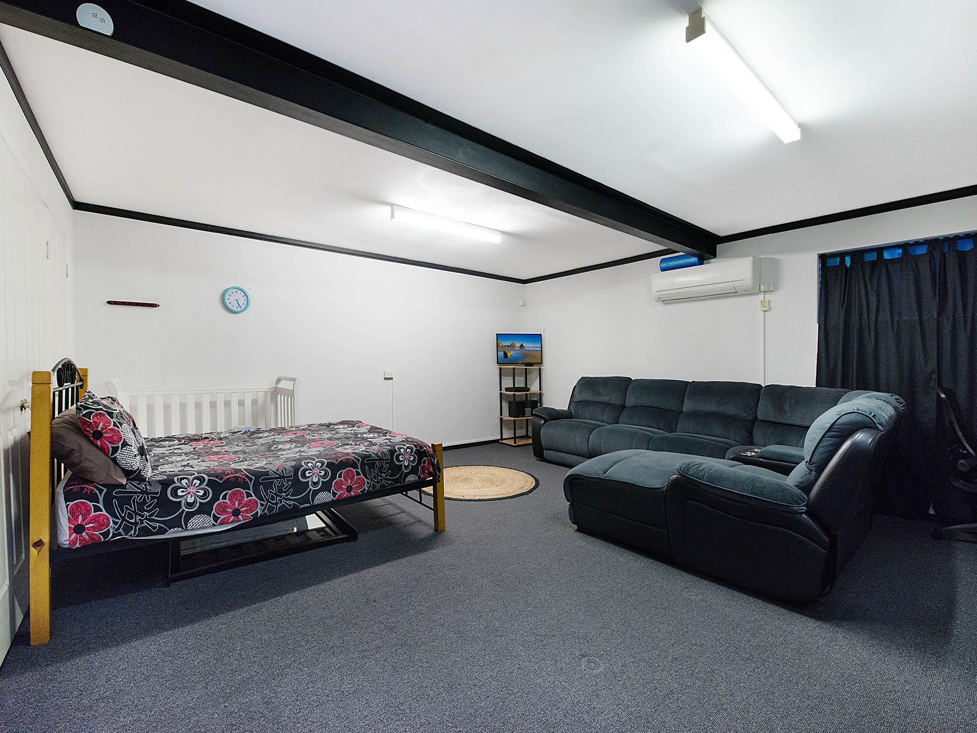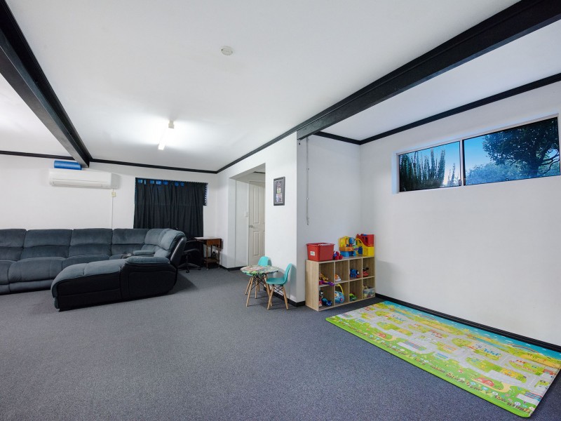Walk down the internal steps to the other living area: a massive space that includes a toilet and kitchenette. Make this into your 'cave', a pool room, or better still, a teenager's haven: a perfect area for the young ones to live in and hang out with their friends in their own space, in air-conditioned comfort.